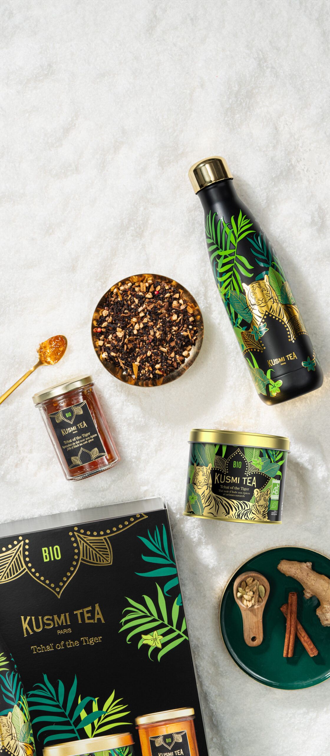 Podobnie jak chai, tradycyjny napój z Indii, Tchaï of the Tiger idealnie łączy czarną herbatę i pachnące przyprawy. Receptura oparta jest na przepisie z Thiasholi, znanego ekologicznego i etycznego ogrodu herbacianego, położonego w południowo-zachodnich Indiach w regionie Nilgiri, gdzie żyją tygrysy chronione przez WWF. Ta czarna herbata czerpie całą swoją moc dzięki połączeniu przypraw organicznych: imbiru, kardamonu, cynamonu, czarnego i różowego pieprzu, wnosząc do mieszanki zadziwiającą równowagę między siłą i miękkością, inspirowaną urzekającym dzikim kotem, którego chroni.